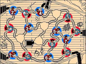Gemeinsame RegelnEinsetzen des Spielsteines: Ein Spielstein kommt dadurch ins Spiel, dass er auf einem der sechs Startfelder eingesetzt wird. Er wird dort so platziert, dass die Unterseite des Piraten auf das schwarze Wegstück zeigt und die Hintergrundgrafik des Spielsteins die zwei Wege auf dem Spielplan fortsetzt. Bewegung: