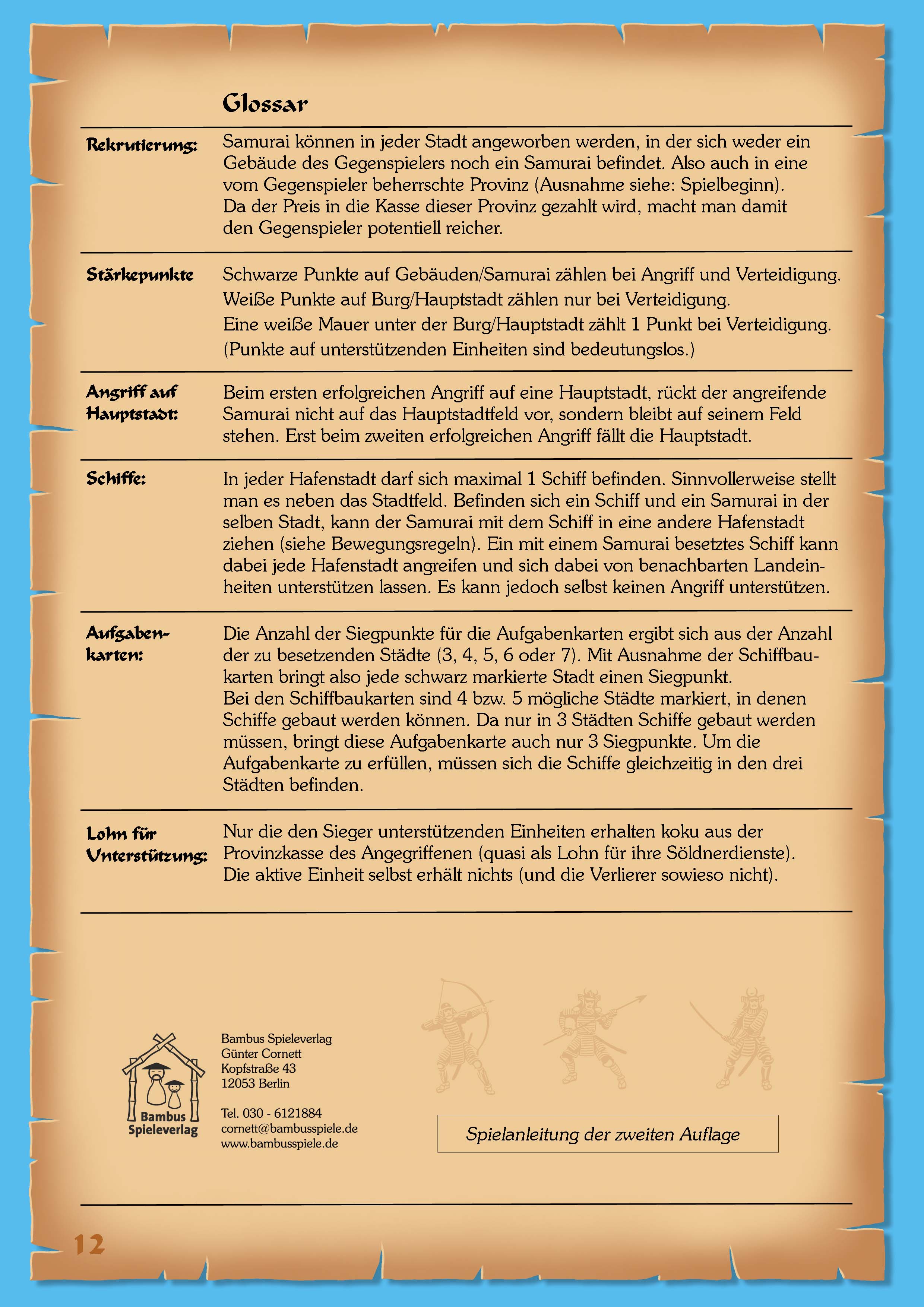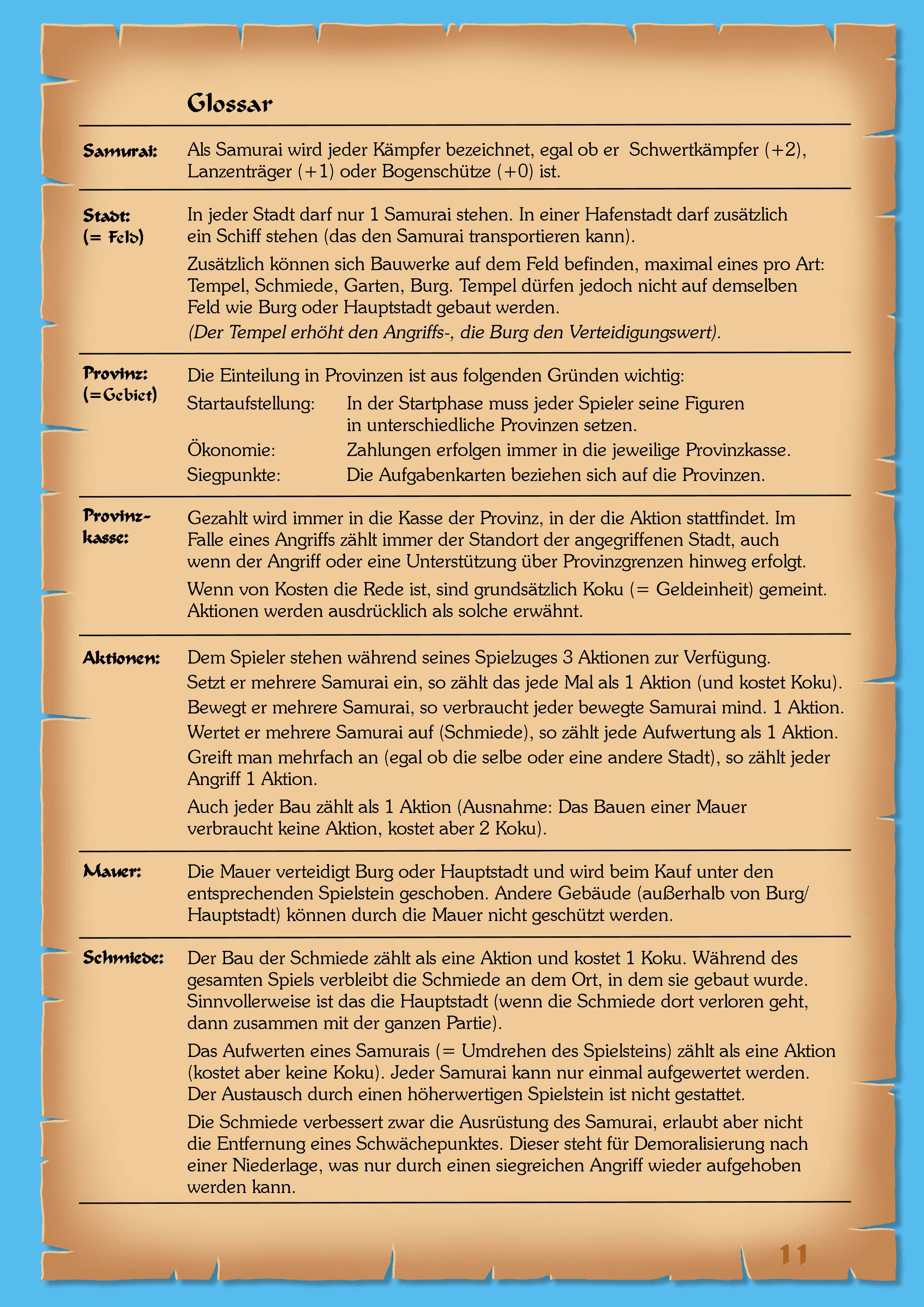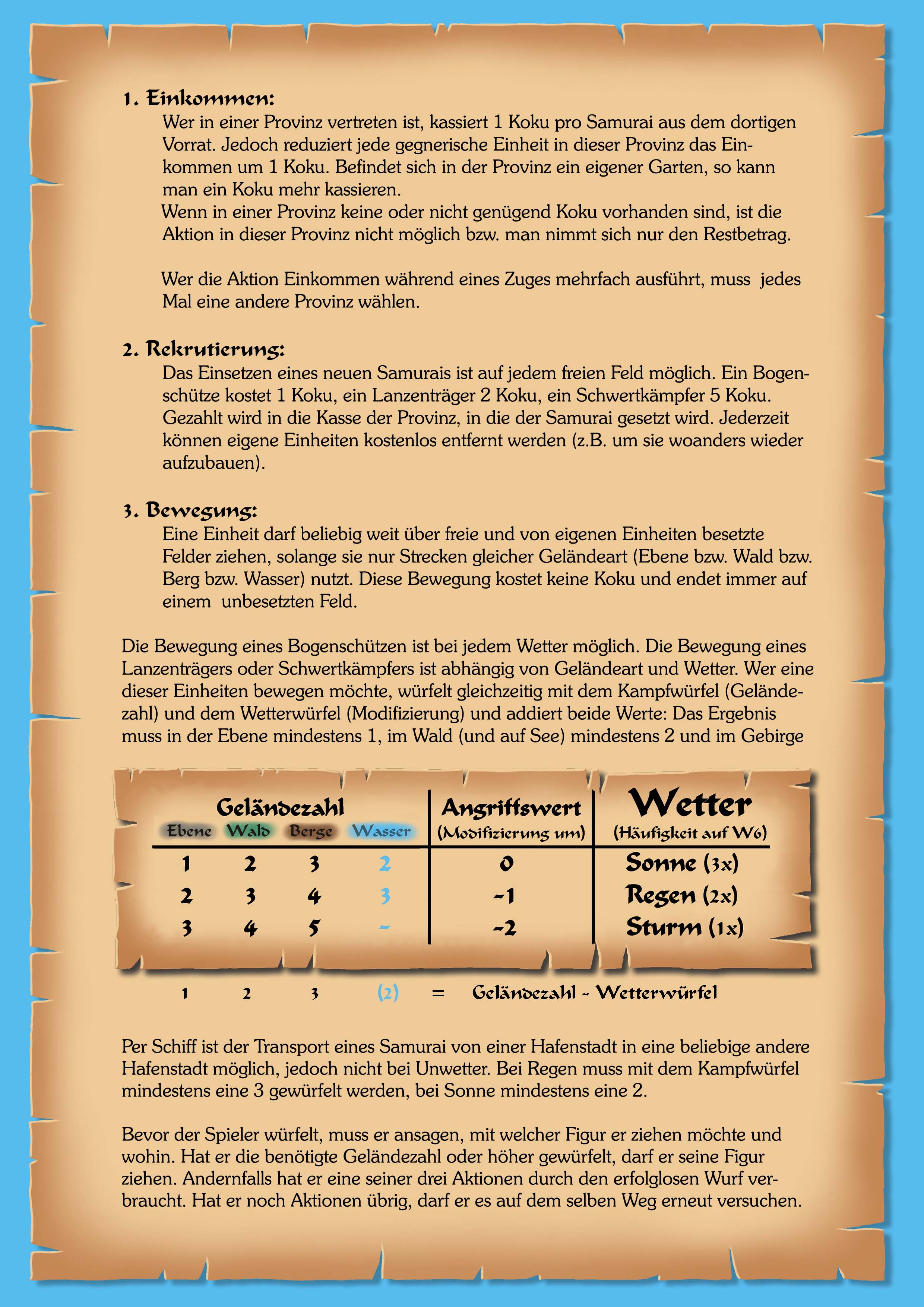![]() |Seite 5| - Spielziel; Spielvorbereitung - Startphase - Aktionsphase: Übersicht Anschauen (72dpi) - Druckqualität (300dpi, 700kb) ![]() |Seite 6| - Aktionsphase: 1. Einkommen 2. Rekrutierung 3. Bewegung Anschauen (72dpi) - Druckqualität (300dpi, 800kb) ![]() |Seite 7| - Aktionsphase: 4. Angriff a) Bewegung b) Unterstützung c) Kampf d) Auswertung Anschauen (72dpi) - Druckqualität (300dpi, 900kb) ![]() |Seite 8| - Aktionsphase: 4. Angriff Beispiel Anschauen (72dpi) - Druckqualität (300dpi, 1400kb) ![]() |Seite 9| - Aktionsphase: 4. Angriff d) Auswertung (Forts.) e) Sonderregeln 5. Bauen 1. Schiffe 2. Gärten 3. Schmiede 4. Burg Anschauen (72dpi) - Druckqualität (300dpi, 800kb) ![]() |Seite 10| - Aktionsphase 5. Bauen 4. Burg (Forts.) 5. Tempel 6. Mauern - Aufgabe erfüllt; Geldmangel? - Spielende und Spielsieger Anschauen (72dpi) - Druckqualität (300dpi, 800kb) ![]() |Seite 11| - Glossar: Samurai, Stadt (=Feld), Provinz (=Gebiet), Provinzkasse, Aktionen, Mauer, Schmiede Anschauen (72dpi) - Druckqualität (300dpi, 1100kb) ![]() |Seite 12| - Glossar: Rekrutierung, Stärkepunkte, Angriff auf Hauptstadt, Schiffe, Aufgabenkarten, Lohn für Unterstützung Anschauen (72dpi) - Druckqualität (300dpi, 900kb) |