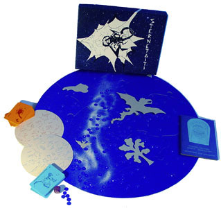 ![]() Das kosmische Spielepaket. Der Spielplan ist eine grosse Scheibe, auf der Vorderseite ist der Sommer- auf der Rückseite der Winterhimmel der nördlichen Halbkugel dargestellt. 9 verschiedene Spiele rund um den Kosmos, die Sternkonstellationen, Planeten und Satelliten. Das Spiel enthält ein ausführliches Begleitheft. |