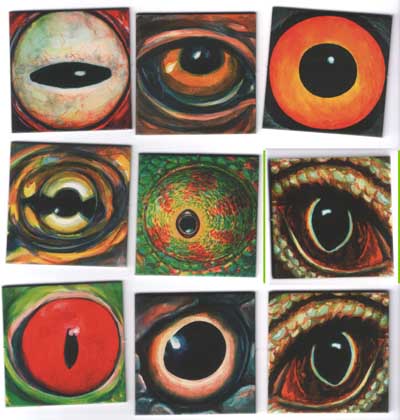 ![]() Augen von 28 Tieren, u.a.: Borneo-Flugfrosch Nasenaffe Uhu Königskobra Jemen- chamäleon Grüner Leguan Scharnier- schildkröte Rotaugen- laubfrosch |